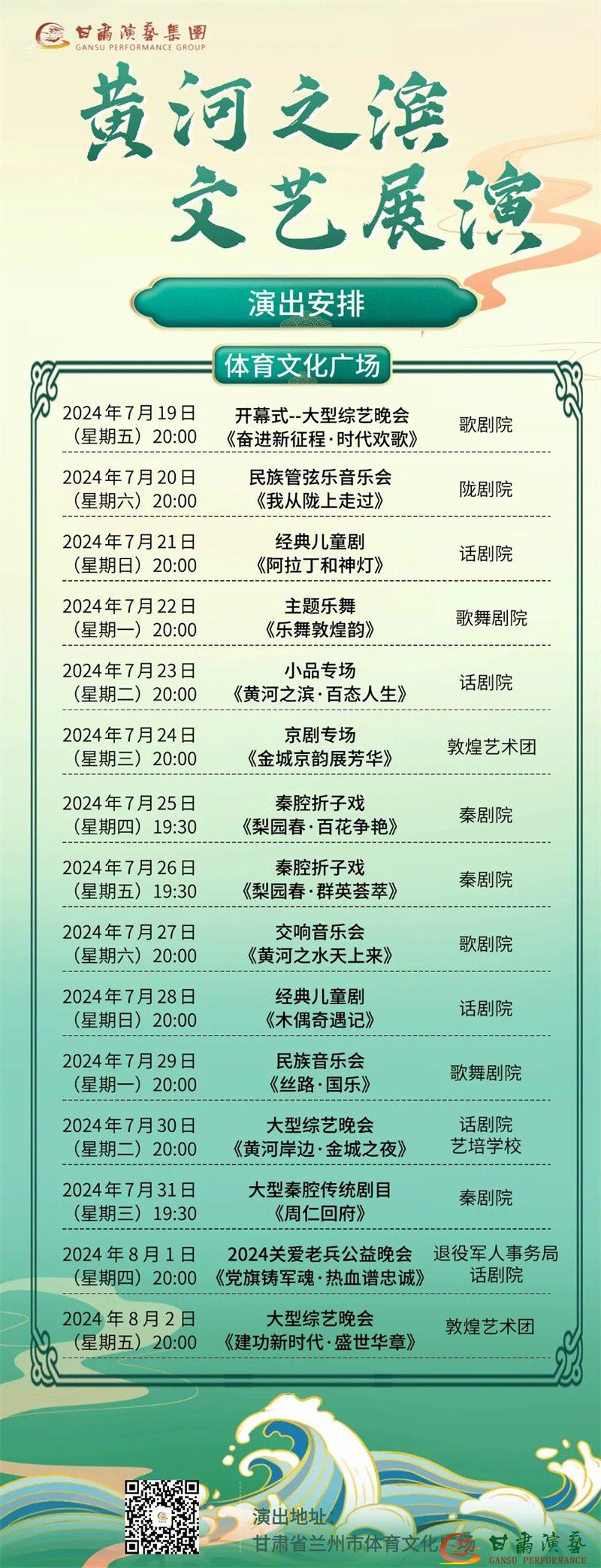 展演期間,在體育文化廣場將安排15場文化惠民演出。同時,甘肅黃河劇院、人民劇院、甘話60劇場、77·演藝工場等也將作為分劇場,共計演出40場。演出形式豐富多樣,涵蓋音樂會、兒童劇、舞劇、戲曲、曲藝、雜技、綜藝等多種藝術(shù)形式,滿足不同觀眾的審美需求。