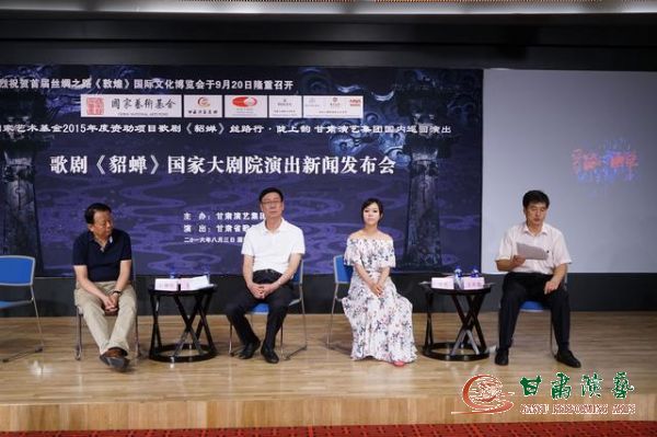 為了熱烈慶祝首屆絲綢之路(敦煌)國(guó)際文化博覽會(huì)于2016年9月20日隆重舉辦,充分發(fā)揮舞臺(tái)藝術(shù)的宣傳優(yōu)勢(shì),努力踐行中共甘肅省委、甘肅省人民政府文化走出去戰(zhàn)略,甘肅演藝集團(tuán)爭(zhēng)取到2015年度國(guó)家藝術(shù)基金資助“絲路行·隴上韻”國(guó)內(nèi)巡演項(xiàng)目支持。茲定于2016年8月12日、13日在國(guó)家大劇院演出兩場(chǎng)甘肅創(chuàng)排的大型原創(chuàng)歌劇《貂蟬》,這是國(guó)家大劇院“泱泱國(guó)風(fēng)·舞動(dòng)經(jīng)典”各省優(yōu)秀原創(chuàng)歌舞劇展演中唯一的一支歌劇項(xiàng)目,是大劇院經(jīng)過(guò)對(duì)全國(guó)眾多優(yōu)秀作品選拔后確定演出的劇作,也是甘肅繼《絲路花雨》《大夢(mèng)敦煌》后又一部在國(guó)家大劇院演出的精品力作。8月3日,甘肅省演藝集團(tuán)、甘肅省歌劇院在國(guó)家大劇院舉行新聞發(fā)布會(huì),大劇院相關(guān)負(fù)責(zé)人及《貂蟬》主創(chuàng)、主演等出席發(fā)布會(huì),向大家介紹了該劇目的創(chuàng)排過(guò)程和核心亮點(diǎn)。