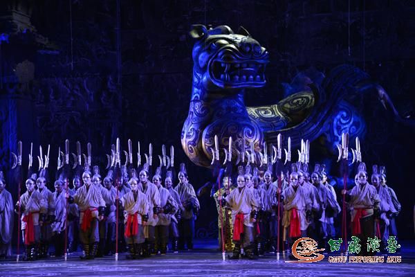 在舞美設(shè)計(jì)方面,背景天幕僅是一整面各種漢畫(huà)像石組成的高墻;前面左右各有一座標(biāo)志性漢闕,中間依場(chǎng)次先后分別更換為巨型的青銅鼎、貔貅與奔馬(馬踏飛燕);場(chǎng)上則有出土的漢說(shuō)書(shū)俑、宮人燈,依不同場(chǎng)次的更換而點(diǎn)綴其間。這種由漢代出土文物組合而成的舞美設(shè)計(jì),顯得很簡(jiǎn)潔大氣,富有歷史感與戲劇氛圍,有一種古樸之美和大寫(xiě)意的象征性。